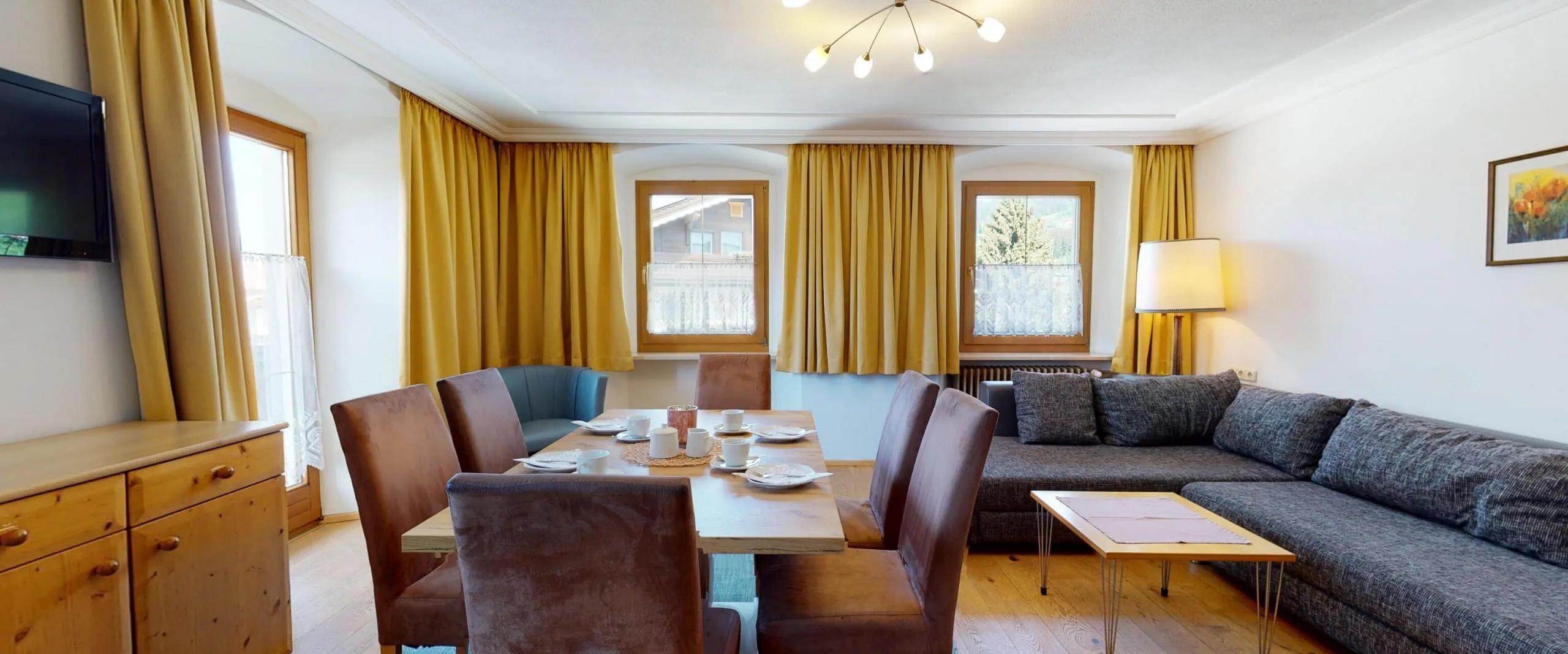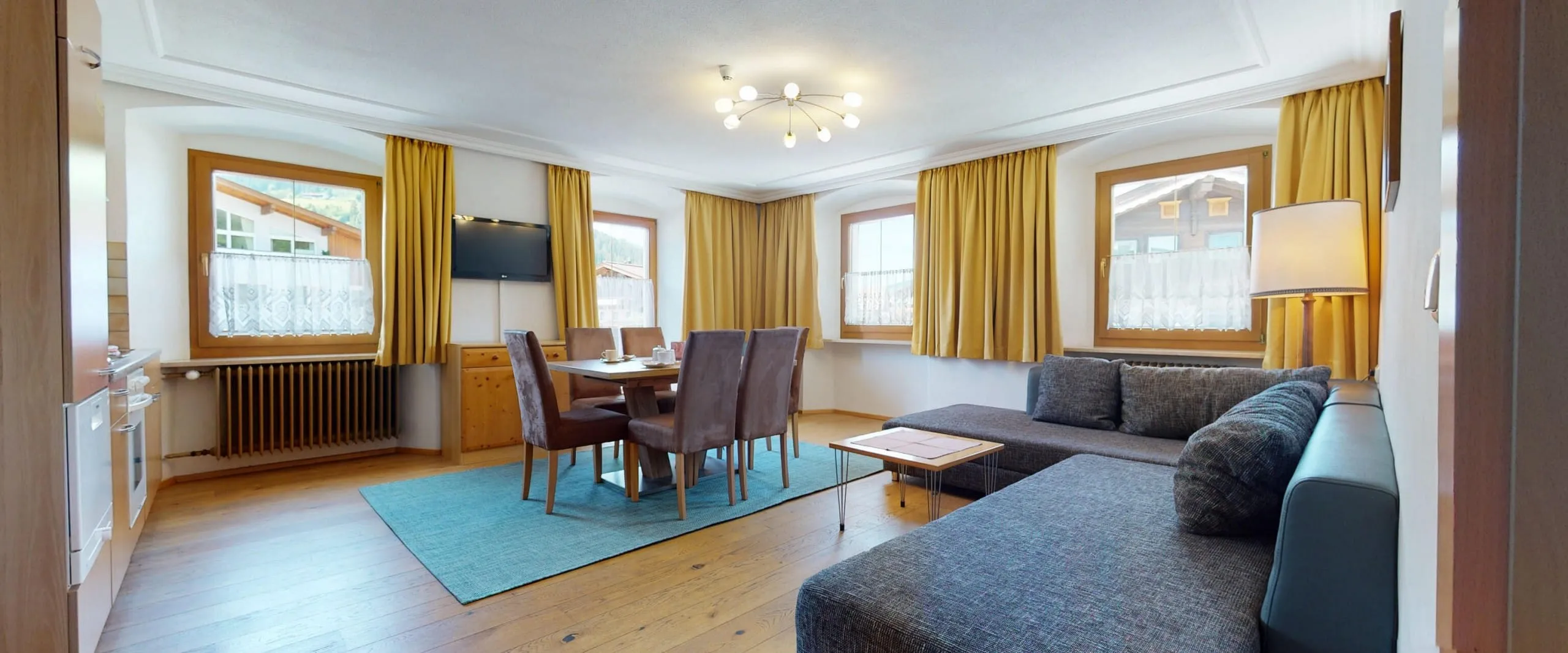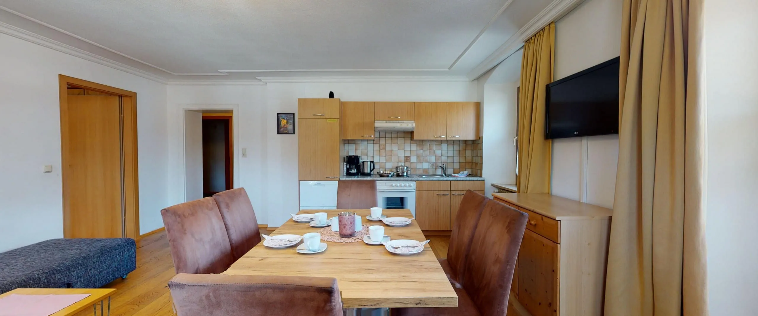 1 Schlafzimmer, 1 Kinderzimmer mit Stockbetten, 1 großes Wohnzimmer mit Essecke, Wohnecke mit ausziehbarer Schlafcouch für 2 Personen (normale Bettgrösse), Küchenzeile mit E-Herd, Geschirrspüler, Gefrier-/Kühlschrank, Kaffeemaschine, Vorraum mit Garderobe, Dusche/WC, Sat-TV, Radiowecker, Telefon, Zimmersafe, W-Lan, Balkon